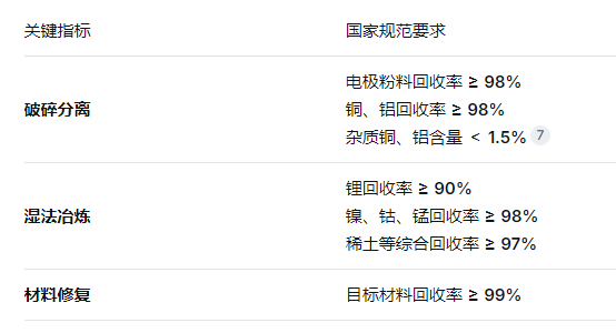 关于锂电池的回收率和回收纯度,目前国家已制定了明确的行业规范,工业和信息化部发布的 《新能源汽车废旧动力电池综合利用行业规范条件(2024年本)》 ,为正规企业设定了明确的准入门槛